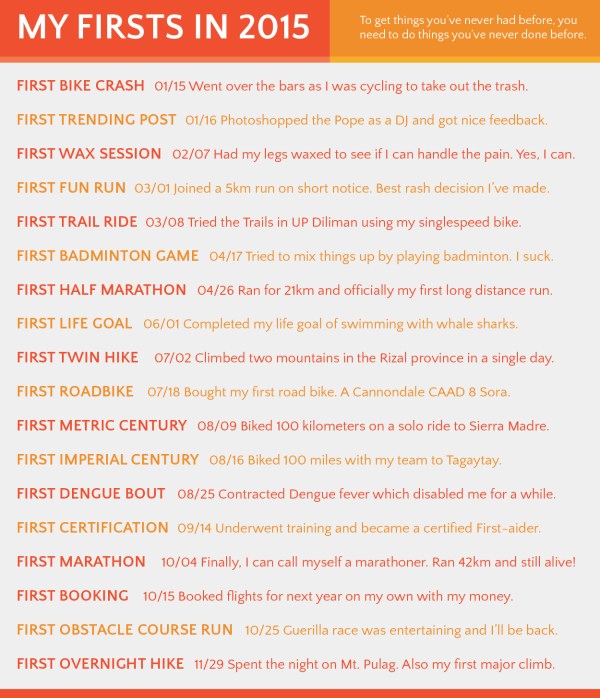 Let me begin by saying that this year, I’ve had a lot of firsts. These things have led to some habit-formation that (I believe) is putting me on the path to become a better person. Here’s a quick rundown of the things I’ve experienced for the first time this 2015.