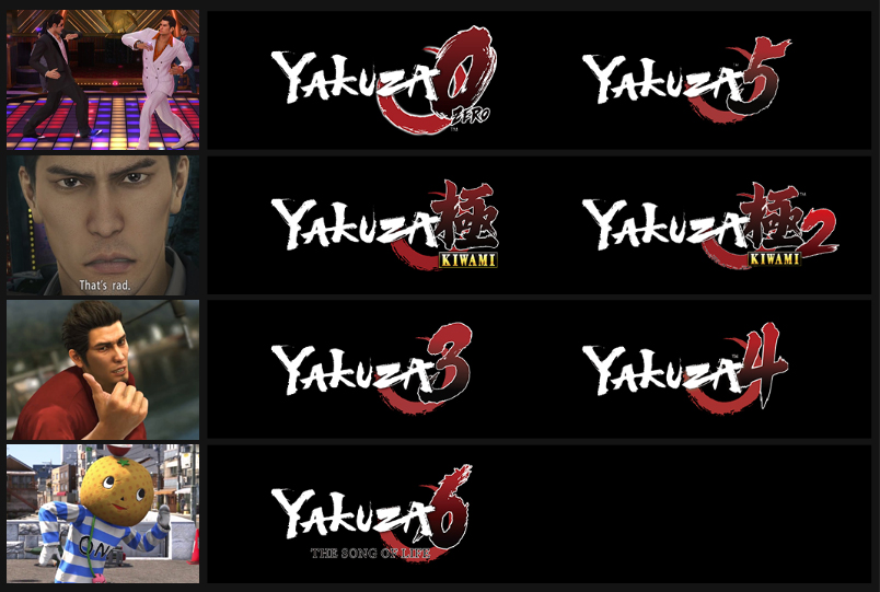 (L-R) Yakuza 0, Yakuza Kiwami (Yakuza 1 Remake), Yakuza Kiwami 2 (Yakuza 2 Remake), Yakuza 3 Remastered, Yakuza 4 Remastered, Yakuza 5 Remastered, Yakuza 6: The Song of Life