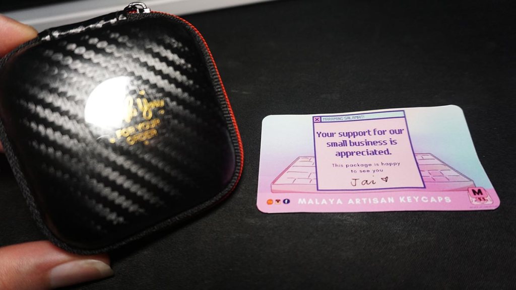 It was a cute little package. I didn’t know that it came with a carbon-fiber patterned zip case! Props to the shop for including this because that means the keycaps are well protected and it’s something I can also use in the future.