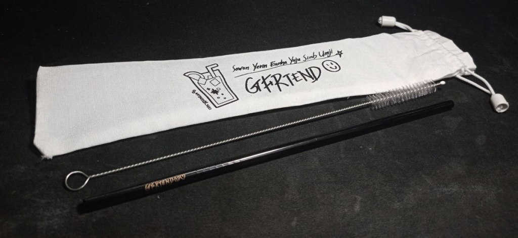 It’s a single metal straw with the Gfriend name on it plus a wire cleaner. I usually order iced coffee at the office and they always serve it with paper straws that get soggy after a few minutes of use. If not paper straws, they send some kind of biodegradable straw made of pasta (?) that tends to break during delivery. So this metal straw is actually another good thing to have as a personal item.