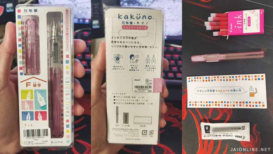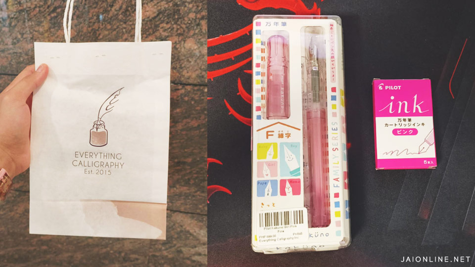 I ordered mine from everythingcalligraphy.com. They offer same-day deliveries and, most importantly, they have the bright pink Kakuno that captured my heart. The specific model I got was the Pilot Kakuno Family Series in Girl Pink color and with a Fine nib.